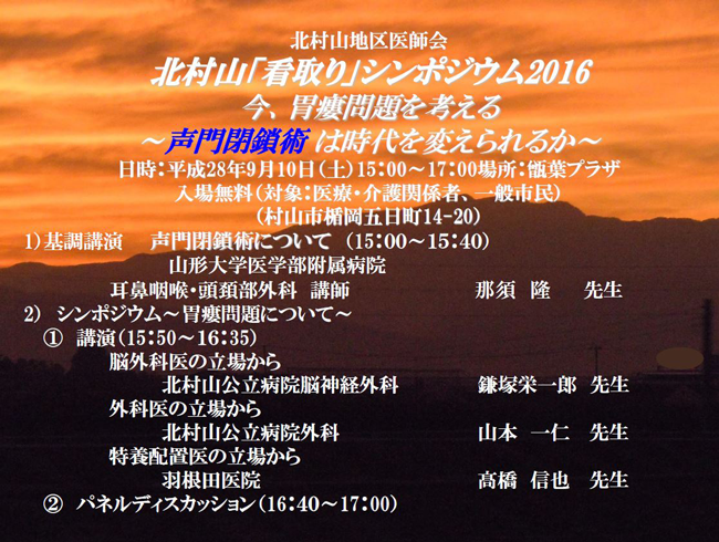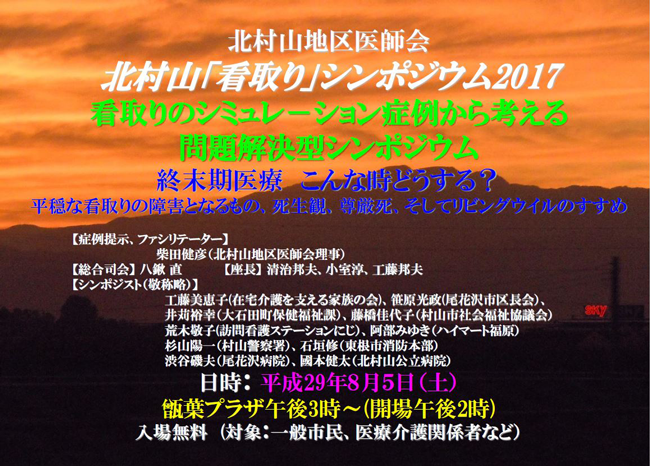 北村山「看取り」シンポジウム2016、2017 投稿日時 : 2017/08/05 北村山地区医師会(i) 北村山医師会 北村山「看取り」シンポジウム2016 今、胃瘻問題を考える ~声門閉鎖術は時代を変えられるか~ チラシ(PDF):看取りシンポジウム・ポスター2016-2017.pdf 北村山「看取り」シンポジウム2017 看取りのシュミレーション症例から考える問題解決型シンポジウム ~終末期医療 こんな時どうする?~ Tweet